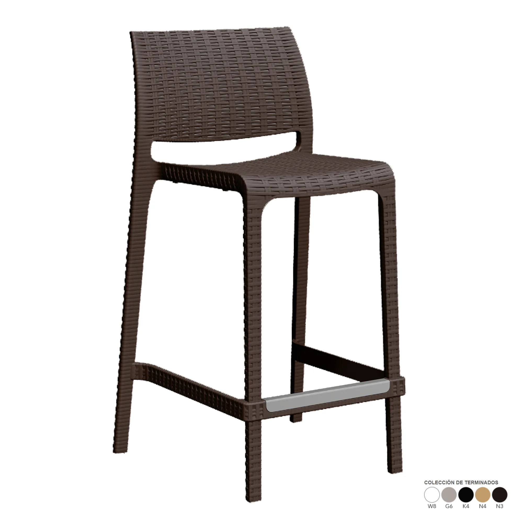 - patas, asiento y respaldo: de una sola pieza en polipropileno de alta resistencia y duración para intemperie, resistente a los rayos ultravioleta (UV) y al ambiente salino.