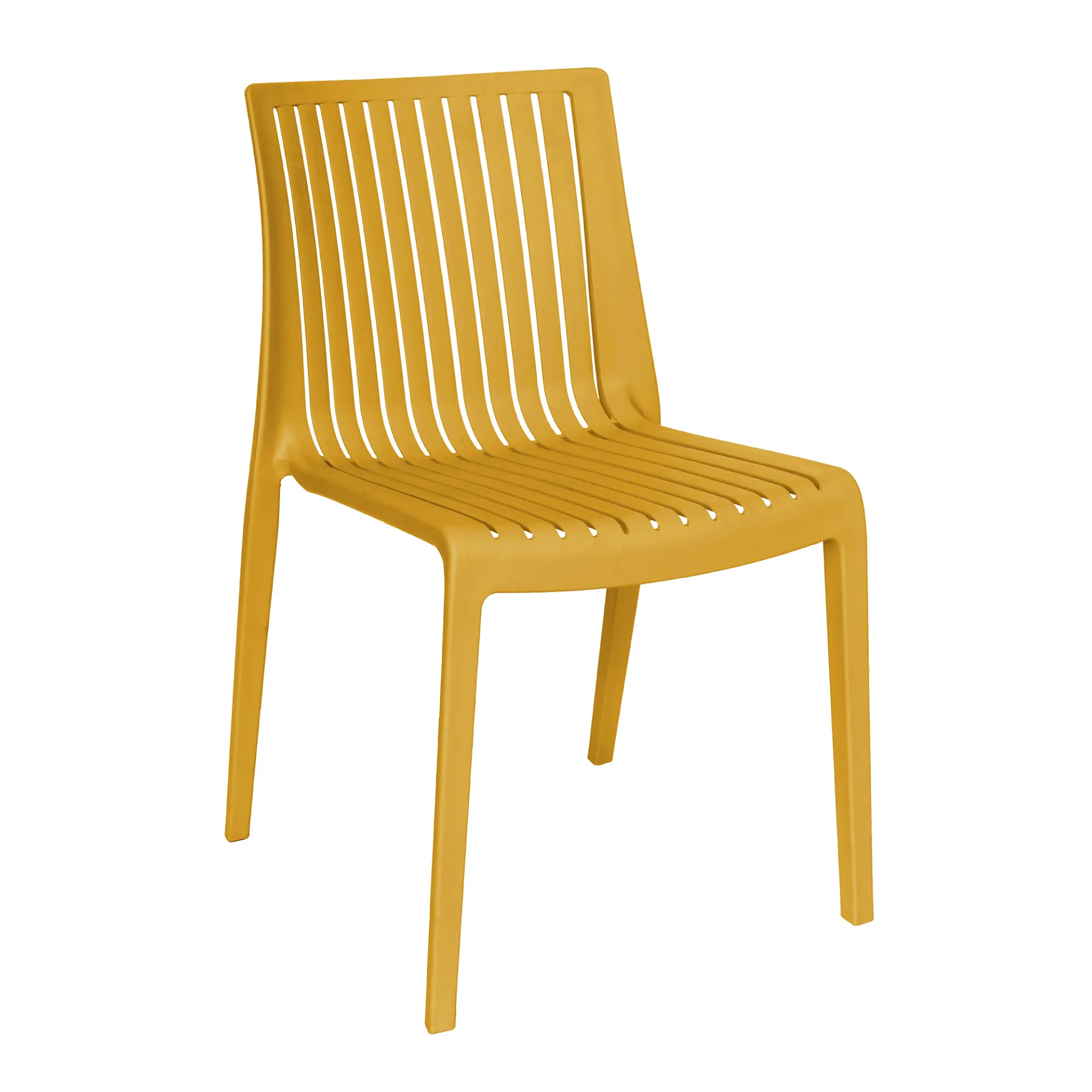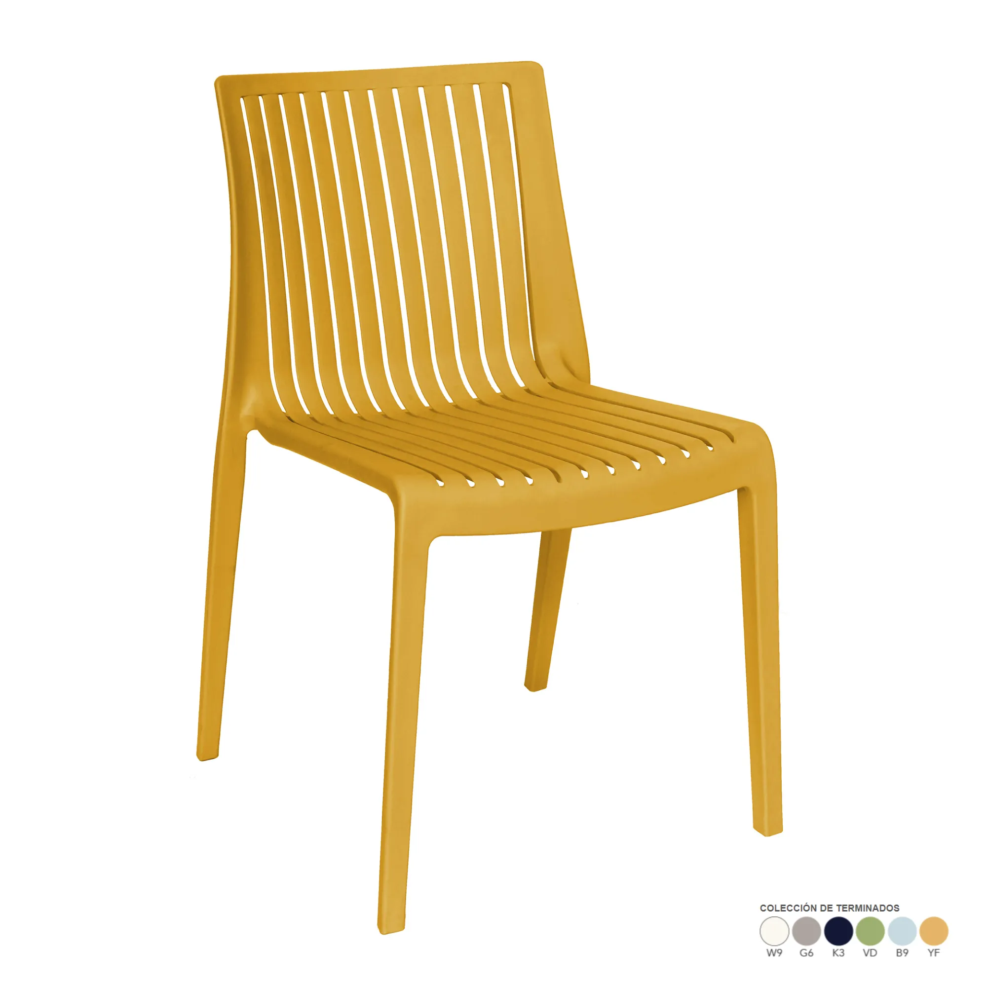 - patas, asiento y respaldo: de una sola pieza en polipropileno de alta resistencia y duración para intemperie, resistente a los rayos ultravioleta (UV) y al ambiente salino.
